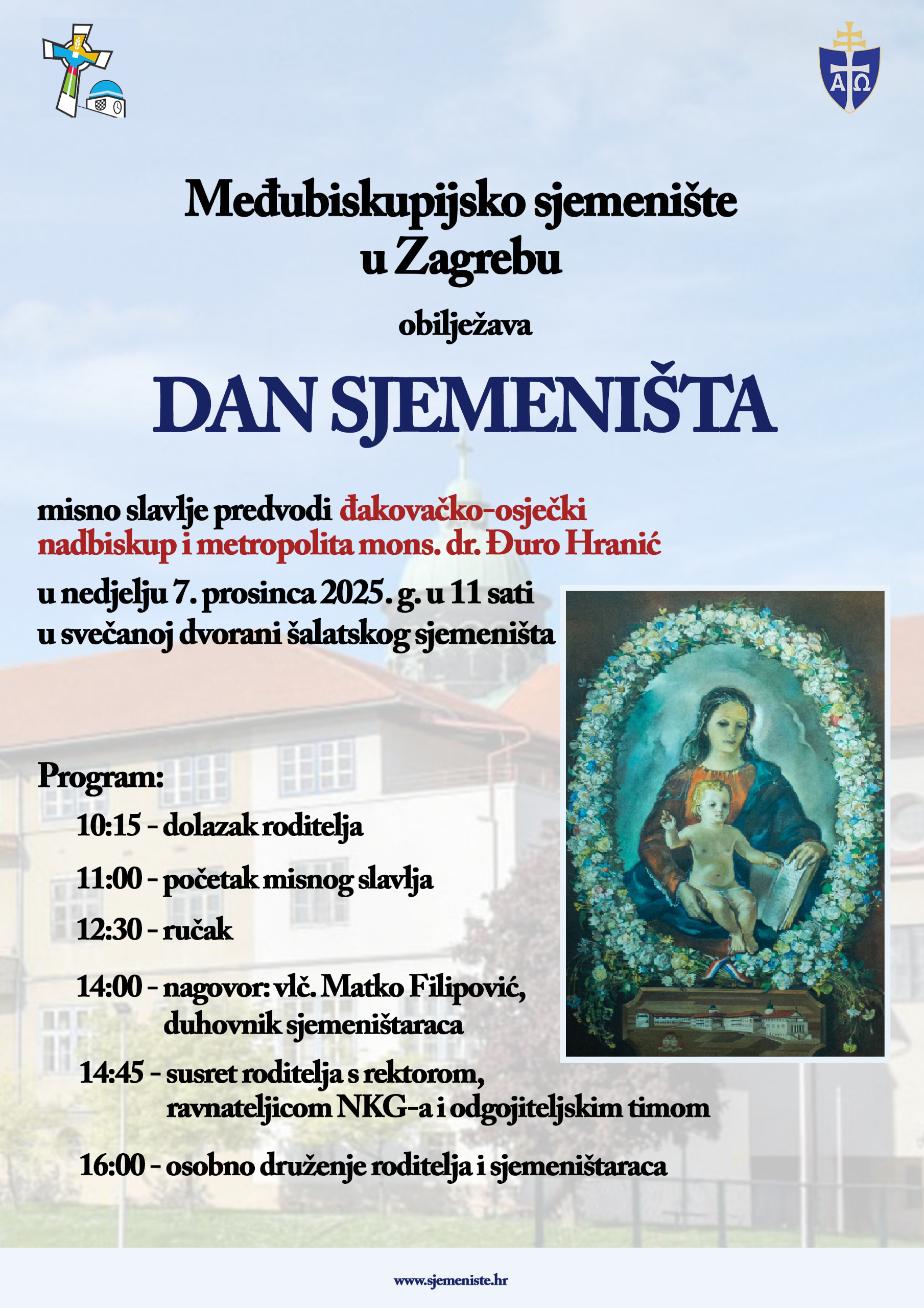 Na drugu nedjelju došašća, 7. prosinca ove godine, đakovačko-osječki nadbiskup i metropolita mons. dr. Đuro Hranić predvodit će, s početkom u 11.00 sati, koncelebrirano euharistijsko slavlje u prostorima svečane dvorane Međubiskupijskog sjemeništa u Zagrebu prigodom proslave Dana sjemeništa.